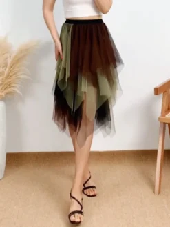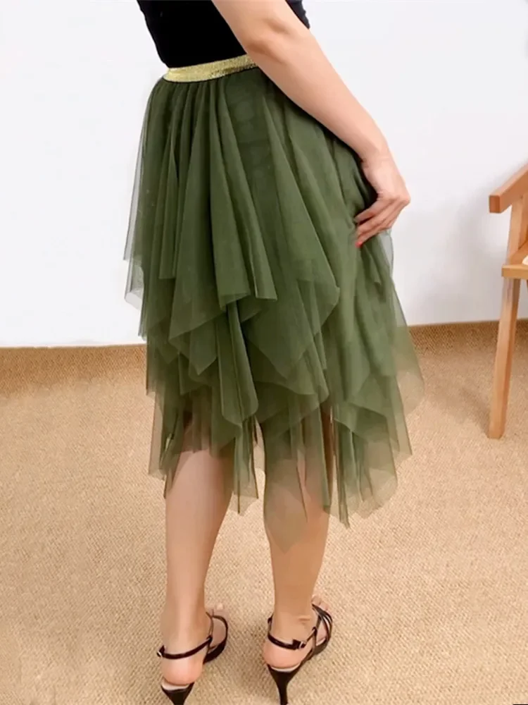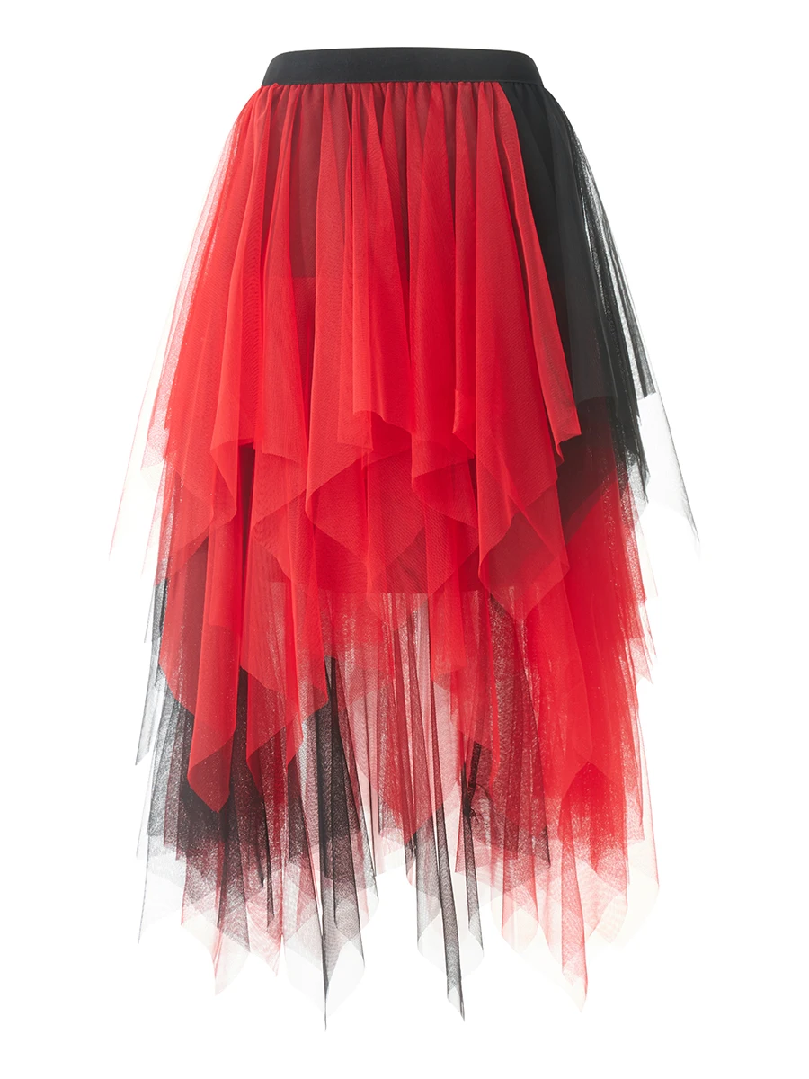 Women Fashion Midi Skirts Contrast Color/Solid Color Elastic High Waist Irregular Ruffles Multi-Layered Tulle Tutu Skirts