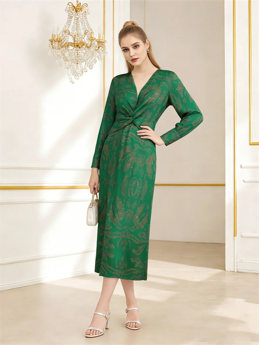 Flower Long Dress for Women Fall Fashionable Deep V Neck Long Sleeve Cinched Waist Dress