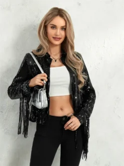 Women's Sequin Party Jackets Sparkly Long Sleeve Open Front Tassel Jackets Blazers Clubwear
