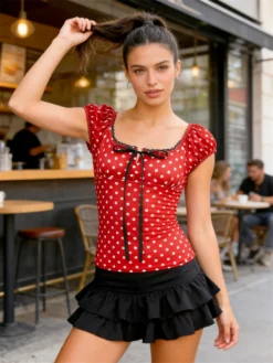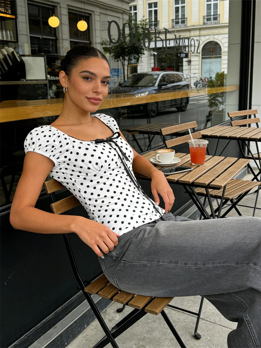 Women's Dot Cap Sleeve Tops Summer Casual Fashionable Square Neck Slim Fit T Shirt