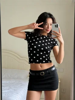 Women’s Summer Crop Top Short Sleeve Round Neck Dot Pattern Slim Fitted T Shirt Streetwear